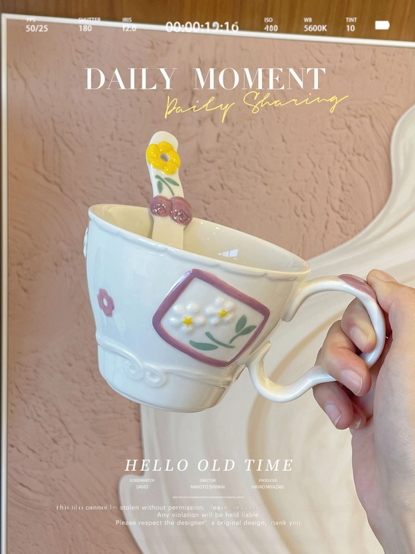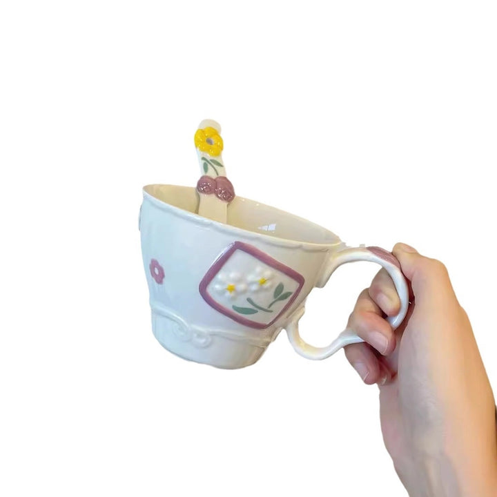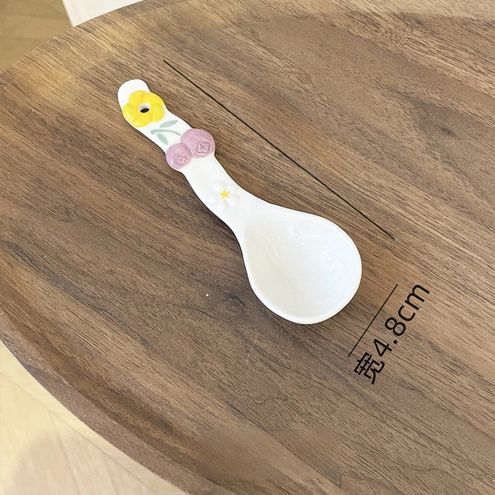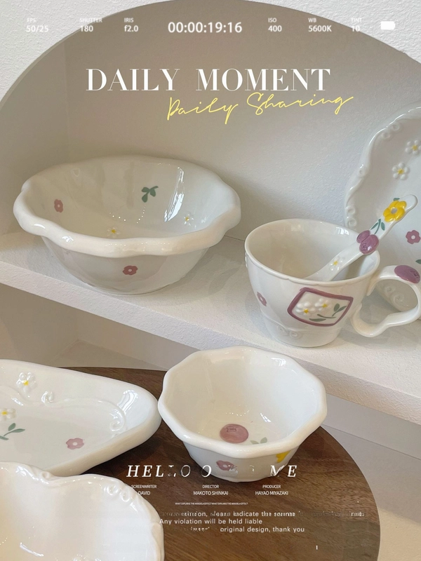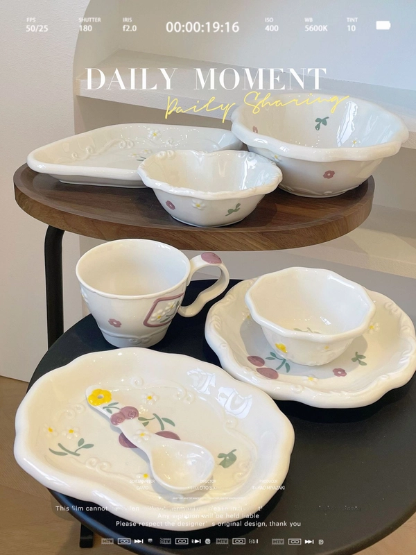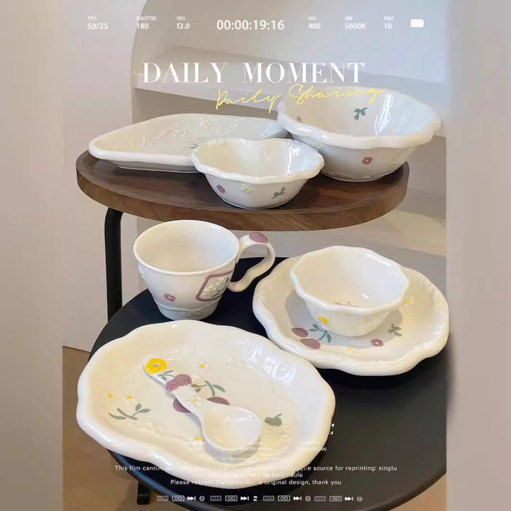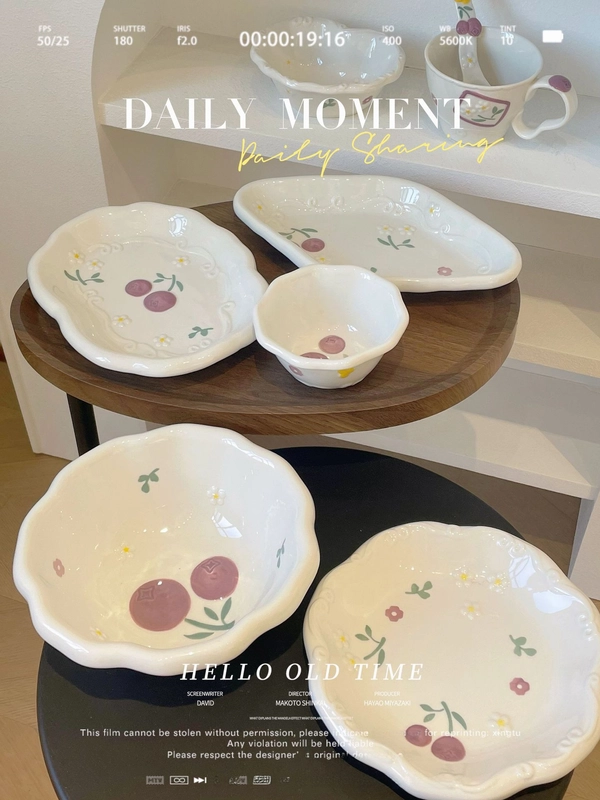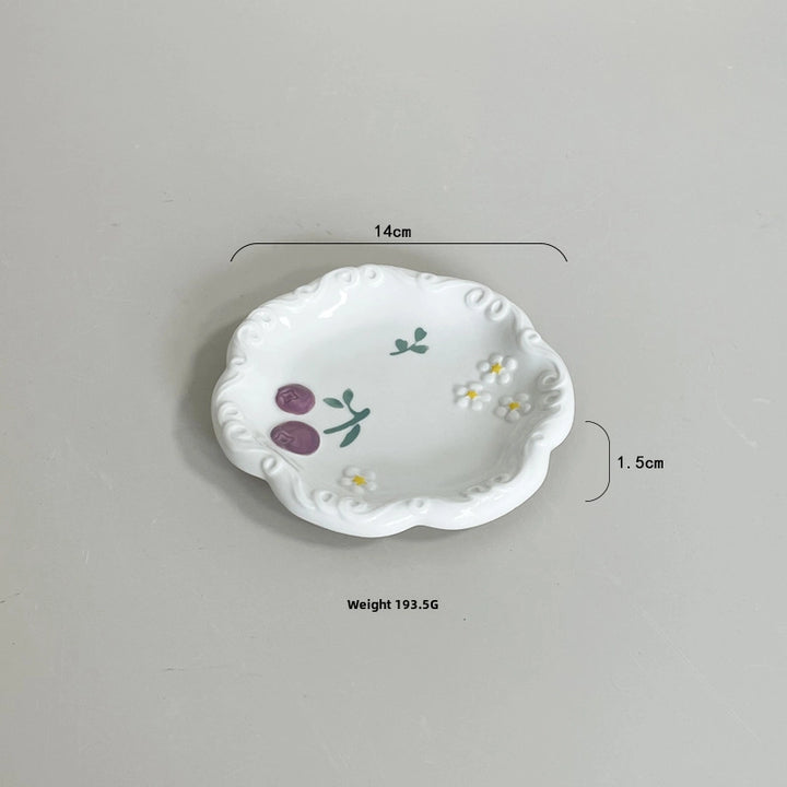 Embossed Fruit Air Cake Plate Household Ceramic Tableware Rice Bowl Disc Deep Plate Cream Color Cute High Face
