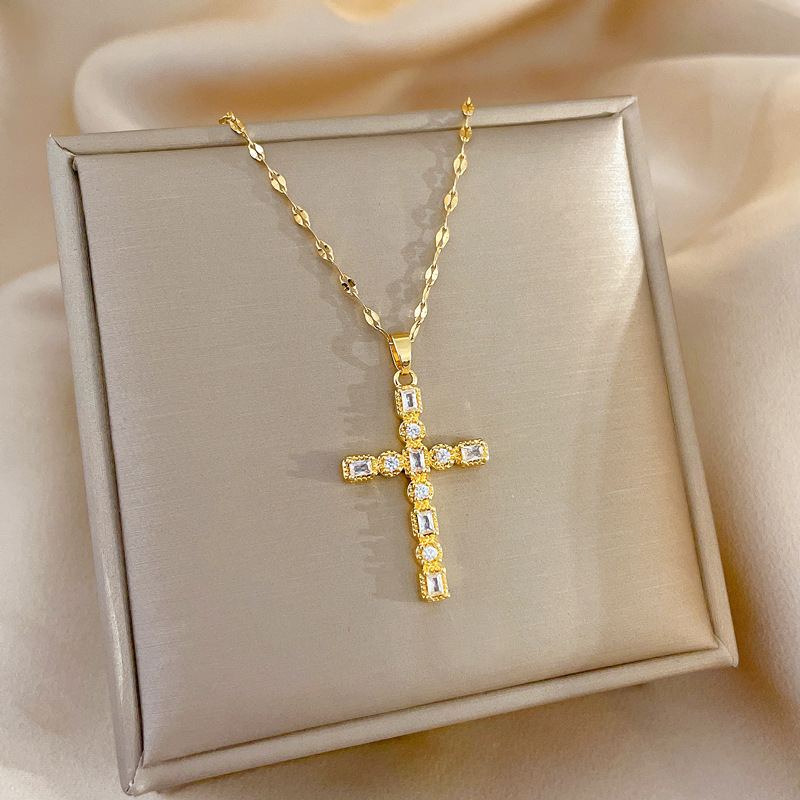 Retro Cross Titanium Steel Copper Inlay Zircon Pendant Necklace