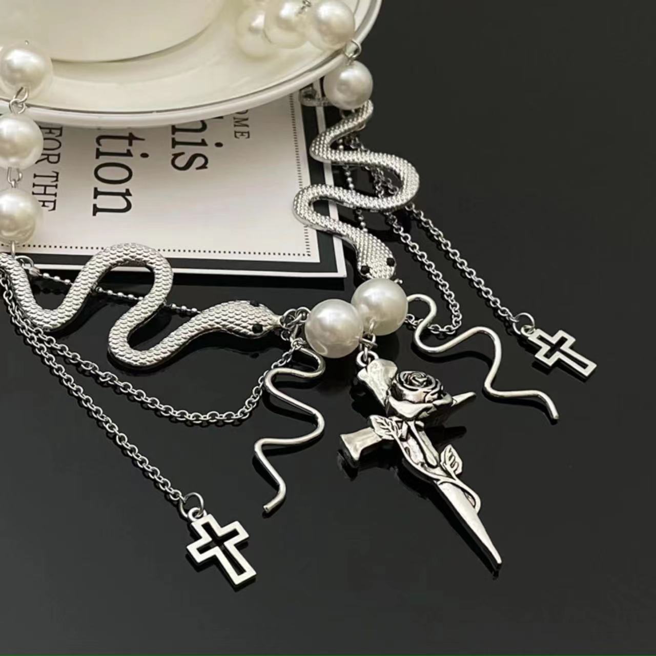 Sweet Cool Style Cross Rose Snake Imitation Pearl Alloy Plating Women'S Necklace