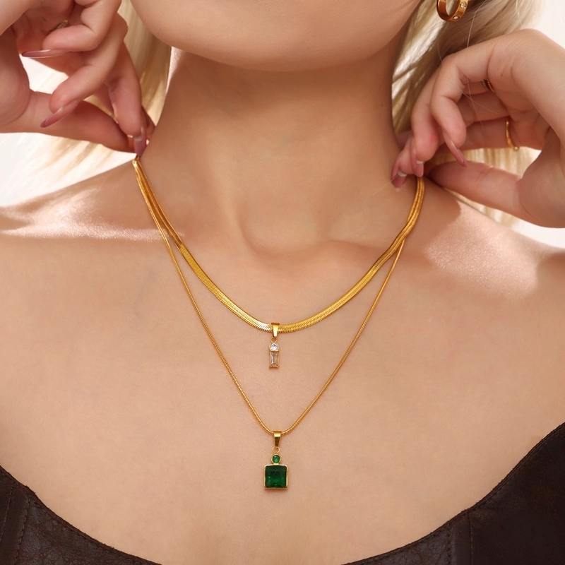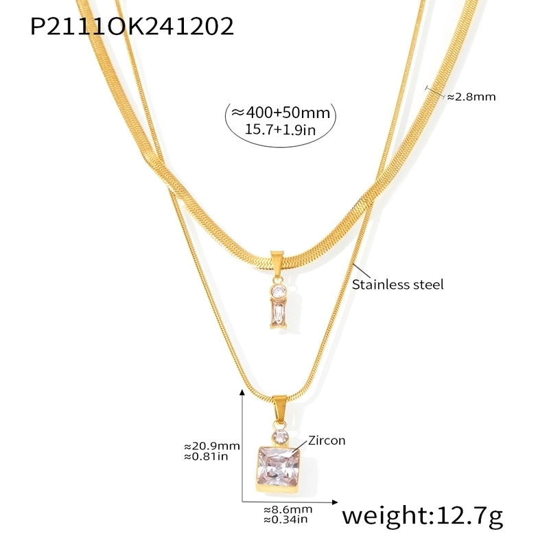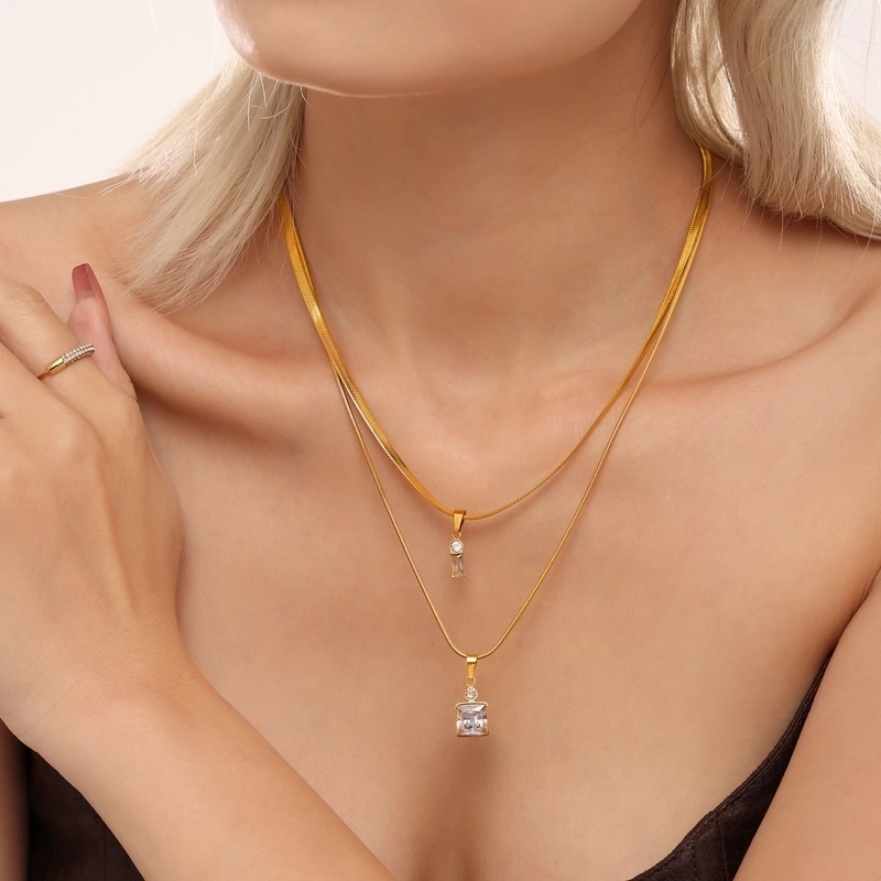 Wedding Vacation Square 304 Stainless Steel Zircon 18K Gold Plated Tassel Double Layer Necklaces